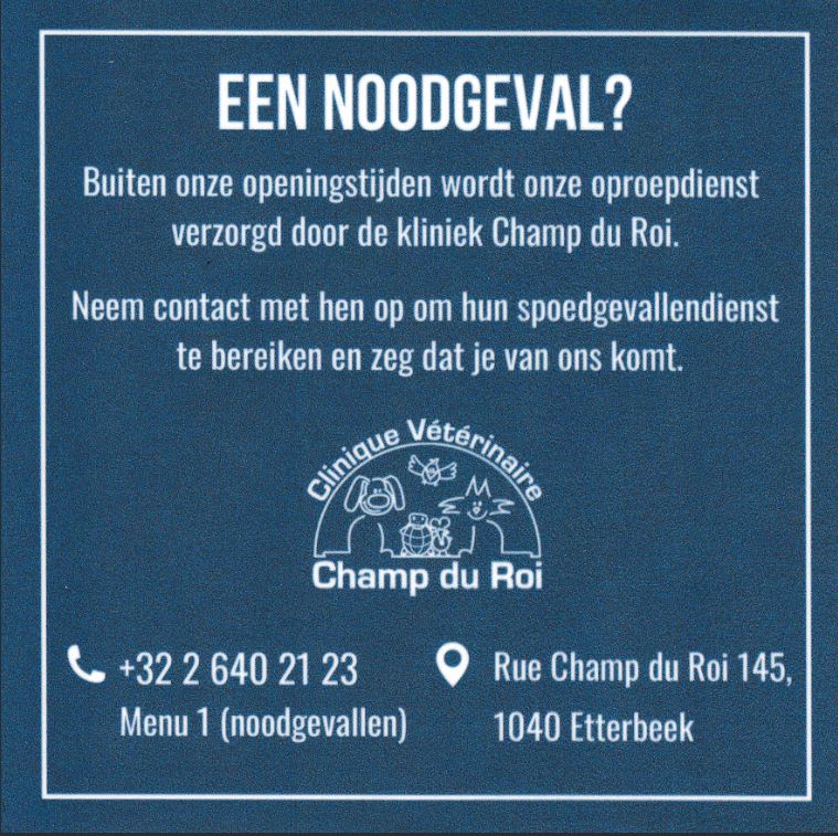 Bij afwezigheid kan u zich voor dringende problemen wenden tot de wachtdienst van Kliniek Champ de Roi te Etterbeek. Gelieve vooraf telefonisch contact op te nemen.